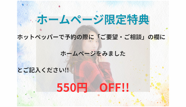 予約の「ご要望・ご相談」の欄にホームページを見ましたとご記入ください。当日サロンにて550円引きにさせていただきます。